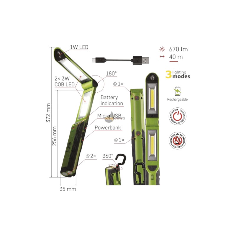 A P4535, 2 COB LED + LED tölthető munkalámpa minden szempontból praktikus. Akár a műhelybe kell világítás, akár azt szeretnénk, hogy otthon vagy útközben mindig kéznél legyen egy megbízható és kellően erős lámpa, a P4535 nem fog csalódást okozni. Tölthető akkumulátora biztosítja, hogy mindig készen álljon a teljes értékű használatra. És ha éppen nincs szükség a fényére, akkor a lámpa tartalék energiaforrásként is szolgálhat. Nem kell powerbanket hordani magunkkal, mobiltelefonunkat, fényképezőgépünket vagy egyéb eszközeinket egyszerűen feltölthetjük közvetlenül a lámpa USB-portjáról.