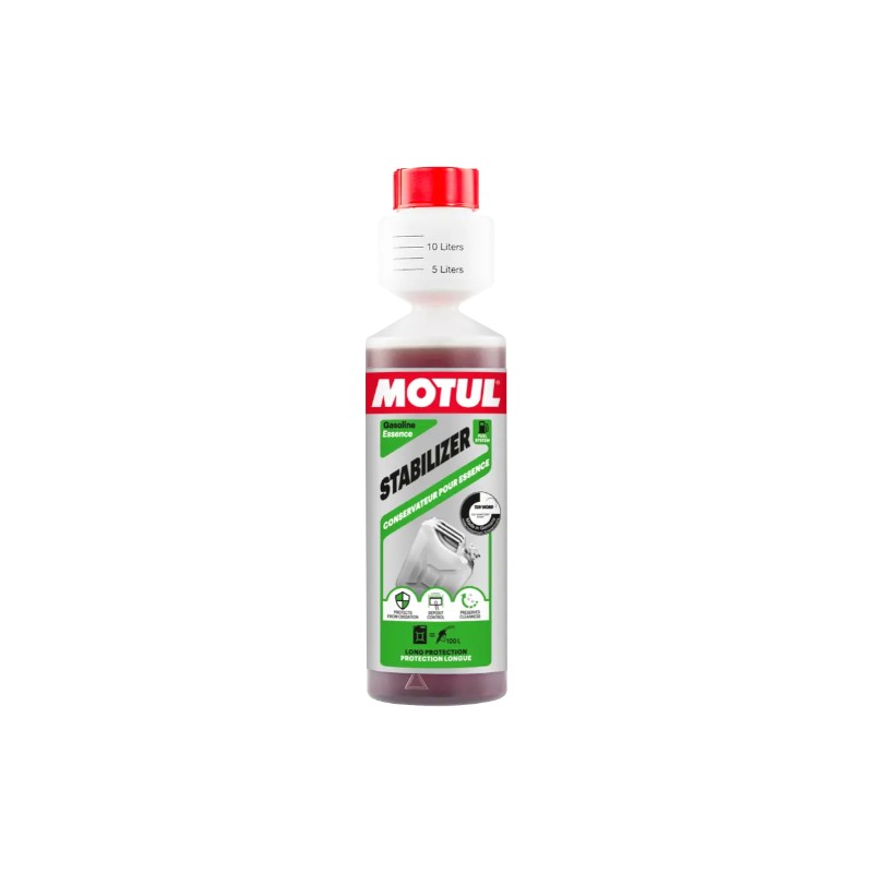 A Motul Stabilizer benzinnel / üzemanyag adalékkal akár 24 hónapig stabilizálja az üzemanyagot. Ideális választás motorokhoz, veterán autókhoz, hajókhoz vagy motoros fűnyírókhoz és egyéb járművekhez. Jobb megőrzést biztosít leállás esetén és jobb indítást téli leállás után. Megakadályozza a bevonatok és lerakódások képződését. Tisztítja a karburátort és az üzemanyagrendszert.